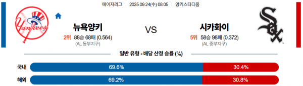 9796 국내야구분석 9월 26일 MLB 뉴욕양키 vs 시카화이 등급아이콘 레벨아이콘 커뮤관리자 09.25 249