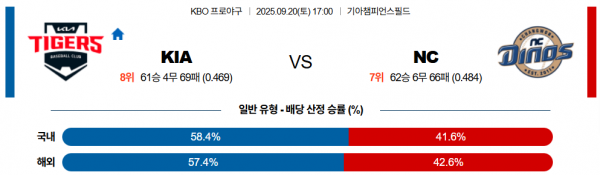 전날 NC의 패배는 그야말로 자멸이라는 표현이 어울릴 정도였다. 최근의 타격을 고려한다면 솔직히 이번 경기에서 양현종 상대로 살아나긴 쉽지 않을듯. 물론 최근 KIA의 타격과 팀 분위기가 엉망이라는건 야구팬이라면 다 아는 사실이긴 하지만 김녹원은 원정에서 기대를 하면 안되는 투수고 NC의 불펜은 KIA보다 더 망가져 있다. 선발에서 앞선 KIA가 승리를 가져갈 것이다.