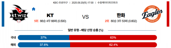 두 팀 모두 전날 경기에서 타격 페이스가 떨어졌다는 공통점이 있다. 이번 경기 역시 그 문제가 터질 가능성을 배제할수 없는 편. 현 시점에서 고영표와 폰세 모두 호투를 기대할법 하지만 고영표의 투구가 조금 더 흔들린다는 점, 그리고 한화의 불펜이 조금 더 안정적이라는 점이 결국 승부를 가르지 싶다. 투수력에서 앞선 한화가 승리를 가져갈 것이다.
