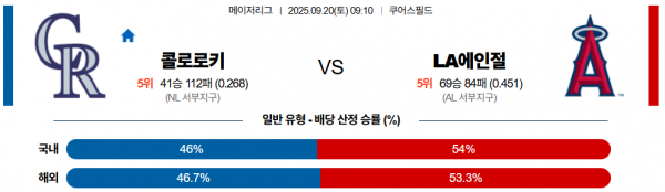 최근 에인절스는 홈런이 본체일 정도로 홈런 의존도가 높다. 이는 쿠어스 필드에서 양날의 검이 될듯. 일단 패리스가 얼마나 버텨주느냐지만 콜로라도는 보기보다 좌완 공략이 좋은 편이고 홈에서의 타격감 자체도 나쁘지 않다. 그리고 불펜이 더 흔들리는건 에인절스다. 홈의 잇점을 가진 콜로라도 로키스가 승리를 가져갈 것이다.