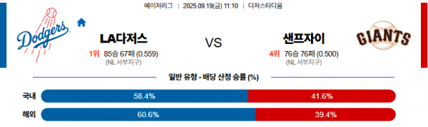 9604 국내야구분석 9월 20일 MLB LA다저스 vs 샌프자이 등급아이콘 레벨아이콘 커뮤관리자 09.19 220