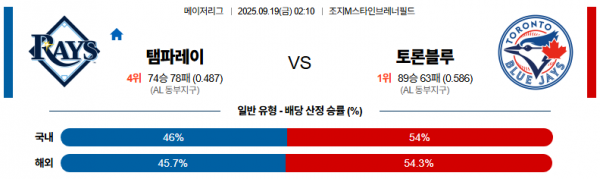전날 경기는 토론토의 좌완 상대 약점이 터져버린 경기였다. 그러나 우완인 바즈 상대로는 승부가 될듯. 이번 시리즈에서 토론토의 타선은 탬파베이의 우완 강속구 투수들 상대로는 강점을 보여주고 있다. 반면 탬파베이의 타선은 여전히 부진하고 전날 가즈먼 상대로 단 1점으로 막힌건 시사하는 바가 크다. 상성에서 앞선 토론토 블루제이스가 승리를 가져갈 것이다.