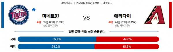 최근의 애리조나는 불펜 문제가 심각하다. 그걸 능가하는 타격과 선빌이 나와주느냐가 관건. 하지만 오버는 홈에서 강한 투수고 최근의 라이언보다는 오히려 투구가 더 나은 편. 반면 크리스맷은 원정 문제가 매우 심각한 투수다. 선발에서 앞선 미네소타 트윈스가 승리를 가져갈 것이다.