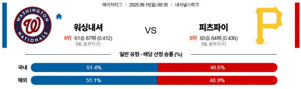 9월 15일 MLB 워싱내셔 vs 피츠파이