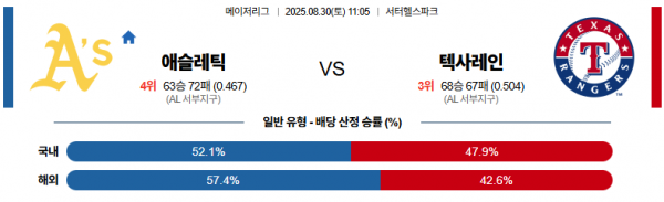 8월 30일 MLB 애슬레틱 vs 텍사레인