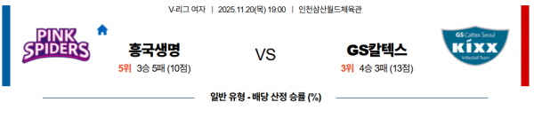흥국생명은 직전경기(11/16) 홈에서 대전 정관장 상대로 3-0(25:16,25:14,25:20) 승리를 기록했으며 이전경기(11/13) 원정에서 페퍼저축은행 상대로 1–3(22:25, 25:23, 26:28, 23:25) 패배를 기록했다. 최근 3경기 2승1패 흐름 속에 블로킹 11-5, 서브 3-3, 범실 10-20의 결과. 레베카(21득점)가 3경기 연속 20득점 이상을 기록했고 이고은 세터의 결장 속에 서채연, 이나연 세터의 역할 분잠이 좋았던 경기. 시즌 첫 3-0 승리였으며 블로킹에서 우위를 보이고 범실을 최소화 하는 집중력이 좋았던 모습. 정규시즌 홈경기에서는 2승2패 성적.