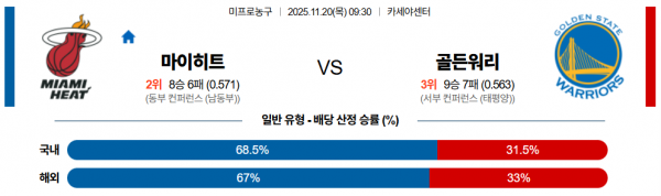 마이애미는 아데바요와 히로가 빠져도 파월과 웨어를 중심으로 팀 득점 분배가 안정적이며 홈에서 6승1패로 흐름이 매우 강하다. 반면 골든스테이트는 백투백 일정에다 커리 의존도가 높고 스몰 라인업 약점으로 리바운드와 페인트존에서 밀리고 있다. 벤치 전력과 수비 로테이션 완성도에서도 마이애미가 우위에 있어 홈 흐름을 이어갈 가능성이 높다. 마이애미 승리가 예상된다.