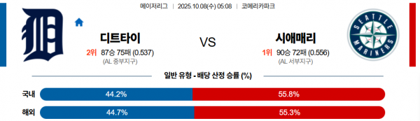 열람중 국내야구분석 10월 8일 MLB 디트타이 vs 시애매리 등급아이콘 레벨아이콘 커뮤관리자 10.07 252