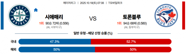 토론토의 타격이 불을 뿜기 시작했다. 반면 시애틀은 홈 경기 문제가 제대로 터지고 있는 중. 커비와 카스티요가 무너진 상황에서 밀러의 호투를 기대하긴 패턴적으로 어려운 편. 물론 가즈먼의 투구는 원정에서 아쉽긴 하지만 시애틀의 타격도 상당히 아쉽고 결국 이 차이가 승부를 가를 것이다. 힘에서 앞선 토론토 블루제이스가 승리를 가져갈 것이다.