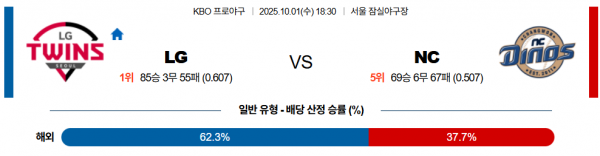 LG가 위험해지고 있다. 매직넘버 1을 2경기 연속으로 지우지 못하고 있는 중. 하지만 어빈과 김태경의 차이는 솔직히 대단히 큰 편이고 홈에서 치리노스는 충분히 호투를 기대할수 있는 레벨. 물론 전날 불펜이 공략당하긴 했으나 NC의 타선은 홈에 비해 원정의 타격이 조금 아쉽고 무엇보다 김태경은 믿기 어렵고 NC 불펜의 소모도 크다. 전력에서 앞선 LG가 승리를 가져갈 것이다.