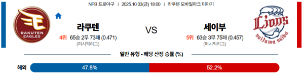 세이부 라이온즈는 요자 카이토(6승 5패 2.67)가 시즌 7승 도전에 나선다. 23일 치바 롯데 원정에서 8이닝 1실점의 호투를 하고도 타선의 부진으로 패배를 당한 요자는 이번 시즌 기대 이상의 투구를 과시한바 있다. 라쿠텐 상대로 이번 시즌 원정 투구가 5이닝 2실점 정도를 해주고 있는데 이번 경기도 비슷할 것으로 보인다. 전날 경기에서 소타니를 공략하면서 6점을 올린 세이부의 타선은 오히려 순위가 거의 다 결정이 나니 좋은 타격을 이어가는 중이다. 2차 방출에서 살아남기 위한 몸부림이라고 해도 좋을듯. 3이닝동안 1실점을 허용한 불펜은 카이노의 안정감이 많이 아쉽다.