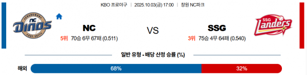 이 경기에서 NC가 승리하게 되면 5위를 결정짓게 된다. 하루의 휴식은 불펜 운용에 큰 도움이 될듯. 거기에 SSG는 이번 경기에서 최선을 다할 가능성이 매우 낮은 편이고 김광현에게도 무리를 시키지 않을듯. 반면 NC는 상황이 그렇지 않다. 선발에서 앞선 NC가 승리를 가져갈 것이다.