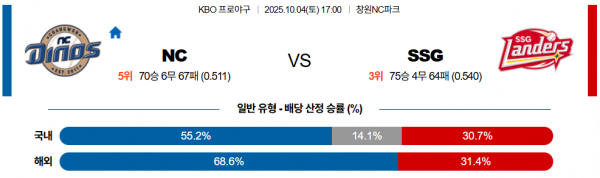 전날 KT가 무승부를 기록하면서 NC는 무조건 승리를 해야 하는 상황이 되었다. 이틀의 휴식은 불펜 운용에 큰 도움이 될듯. 거기에 SSG는 이번 경기에서 최선을 다할 가능성이 매우 낮은 편이고 김광현에게도 무리를 시키지 않을듯. 반면 NC는 무조건 이겨야 한다. 선발에서 앞선 NC가 승리를 가져갈 것이다.