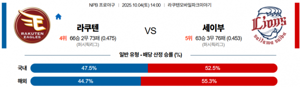 타이라가 무너지면서 세이부의 승리는 날아갔다. 시즌 마지막의 실속은 아쉬움이 남는 부분. 두 팀의 경기 운용을 본다면 라쿠텐은 져도 좋다는 쪽이고 세이부는 어떻게든 이기겠다는 쪽이다. 타카하시의 투구는 원정에서 힘을 발휘할수 있는 반면 지금의 사카이에게 호투를 기대하긴 어렵다. 선발에서 앞선 세이부 라이온즈가 승리를 가져갈 것이다.