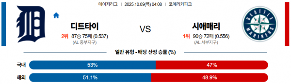시애틀 매리너스는 브라이스 밀러를 내세워 시리즈 종결을 노린다. 금년 4승 6패 5.68의 부진한 투구를 보여준 밀러는 기존의 기대치에 비해 금년의 투구는 상당히 좋지 않은 편이엇다. 기본적으로 원정 약점이 강한 투수이기 때문에 솔직히 긴 이닝을 기대하기엔 무리가 있을 것이다. 전날 경기에서 디트로이트의 투수진을 완파하면서 홈런 3발 포함 8점을 올린 시애틀의 타선은 가을 야구에서도 특유의 원정 타격 폭발이 터졌다는 점이 크다. 즉, 이번 경기도 우위를 점유할 가능성을 무시할수 없다는 이야기. 3이닝동안 3실점을 허용한 불펜은 케일럽 퍼거슨의 부진으로 무뇨즈가 소환된게 아쉽다.