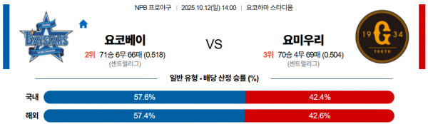 이번 경기는 양 팀 모두 불펜의 피로가 변수가 될 수 있으나, 타격 흐름과 구장의 환경을 감안할 때 다득점 양상이 될 가능성이 크다. 요코하마는 장타율이 상승세에 있고 잭슨의 안정적인 초반 운영이 기대되는 반면, 요미우리는 선발 토고의 구위 저하로 초반 실점 부담이 클 수 있다. 경기 후반 요코하마 불펜의 피로 누적이 있으나 홈 이점이 커, 초반 리드 유지가 이루어진다면 큰 실점 없이 승리를 이어갈 가능성이 높다. 마운드에서 잭슨이 중심을 잡고, 중심 타선이 현재의 활발한 타격 흐름을 이어간다면 경기 주도권은 요코하마가 가져갈 것으로 보인다. 불펜 변수를 고려하더라도 홈에서의 공격 집중력과 파크팩터로 인한 홈런 확률이 높은 만큼, 양 팀의 득점 교환이 활발할 것으로 예상된다. 오버 양상 속 요코하마의 한 점차 승리를 예상한다.