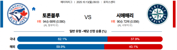 5차전 15이닝 여파로 인해 시애틀은 선발 투수의 로테이션이 심하게 꼬여버렸다. 밀러 혼자 상당히 힘을 내야 하는 상태. 이는 이번 경기의 투수 운용에 트러블을 일으키게 할수 있는 포인트고 토론토의 타선을 막기 어려워 보인다. 반면 가즈먼은 홈 경기에 강점이 있고 시애틀 타선의 부진은 이미 15이닝 3득점으로 입증되었다. 홈의 잇점을 가진 토론토 블루제이스가 승리를 가져갈 것이다.