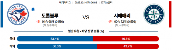브라이스 밀러의 깜짝투가 1차전의 승부를 갈랐다. 토론토로선 시작과 동시에 꽤 아픈 일격을 맞은 셈. 일단 전날 밀러의 투구, 그리고 길버트의 1차전 투구를 생각한다면 이번 경기 역시 팽팽한 투수전 가능성이 높은 편이다. 후반의 힘이 관건인데 이번 경기만큼은 토론토의 기세가 올라올수 있을 것으로 본다. 홈의 잇점을 가진 토론토 블루제이스가 신승을 가져갈 것이다.