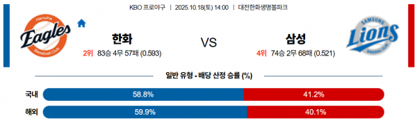 1차전의 우천 취소는 삼성 불펜에게는 정말로 도움이 되는 포인트. 반면 한화 입장에선 SSG가 까다롭다고는 하지만 가을 야구가 단기전에 기세 싸움이라는 점을 고려한다면 실제로는 삼성이 더 까다로운 상대가 될 가능성이 높은 편. 하지만 충분한 휴식 + 1일의 휴식 추가를 가진 폰세라면 쾌투를 기대하기에 부족함이 없다. 오히려 가라비토의 투구를 한화 타선이 얼마나 공략할수 있느냐에 초점이 맞춰질듯. 경기 감각을 고려한다면 5회까지는 접전 또는 한화가 미세하게 우위를 점유할수 있을텐데 불펜전에서 우위를 잡는건 역시 한화일 것이다. 다만 하루의 시간이 더 지났다는 점에서 접전 가능성은 더 높아졌다고 볼수 있다. 투수력에서 앞선 한화가 승리를 가져갈 것이다.