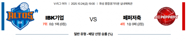 지난시즌 15승21패, 4위를 기록한 IBK기업은행은 첫 경기였던 직전경기 원정에서 GS칼텍스 상대로 1-3(20:25, 21:25, 25:23, 21:25) 패배를 기록했다. 블로킹 11-8, 서브 4-5, 범실 30-14의 결과. 여수 KOVO컵 우승의 상승세를 이어가지 못하고 시즌 개막전에서 예상 밖의 패배를 당한 상황. 빅토리아가 24득점으로 분전했고, 이주아가 17득점과 블로킹 6개로 중앙을 지탱했으며, 최정민도 15득점과 블로킹 3개를 기록했지만 팀 전체의 리듬이 흐트러지며 경기 주도권을 잃었다. 또한, 서브 리시브 불안이 컸고 세트마다 범실이 이어지고 조직력도 떨어지며 반전의 계기를 만들지 못했으며 토종 선수들 중에서 최고 몸값이 되는 이소영은 5득점, 28.7%의 공격 효율성에 그쳤던 패배의 내용.