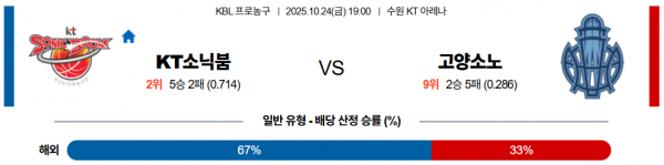 수원 KT는 지난시즌 포함 홈 7연승을 이어가며 안정적인 전력을 유지하고 있다. 데릭 윌리엄스와 하윤기, 아이재아 힉스가 공격의 핵심으로 활약하며 속공 전개에서 강점을 보이고 있다. 반면 고양 소노는 최근 2연패로 하락세에 있고, 야투 성공률과 리바운드 싸움에서 모두 밀리며 경기력 기복이 크다. 특히 원정에서의 수비 집중력 저하가 두드러진다.