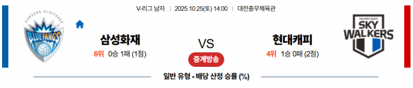 삼성화재는 개막전에서 OK저축은행에 2대3으로 패하며 아쉬운 출발을 보였다. 미힐 아히(OP)가 26점, 김우진(OH)이 20점으로 분전했지만 송명근(OH)의 시즌 아웃 공백이 크게 느껴졌고, 세터 도산지(S)의 교체 이후 경기 운영이 흔들리며 결정력이 부족했다. 반면 현대캐피탈은 개막전에서 KB손해보험을 상대로 3대2로 이기며 디펜딩 챔피언다운 저력을 보여줬다. 공격 밸런스와 수비 안정에서 앞선 현대캐피탈이 다시 한번 힘의 우위를 점하며 연승을 이어갈 가능성이 높다.