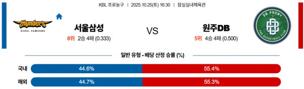 서울 삼성은 최근 2연패로 분위기가 좋지 않다. 앤드류 니콜슨(FW)의 득점력은 여전히 위력적이지만, 리바운드 약세와 세컨드 찬스 실점이 패배의 주요 원인으로 지적된다. 이원석(C)의 부상 결장도 골밑 경쟁력 저하로 이어지고 있고 다음날 홈에서 고양소노를 만나는 일정을 위해서 힘을 분산해야 한다.반면, 원주 DB는 비록 2연패 중이지만 이선 알바노(G)와 헨리 엘런슨(FW)이 꾸준히 활약 중이며, 외곽 공격의 효율이 높다. 강상재(FW)의 부진이 변수지만 리바운드와 높이 싸움에서 삼성을 상대로 우위를 점할 가능성이 크다.