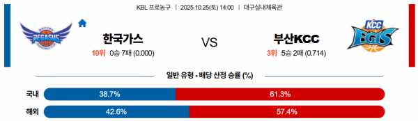 대구 한국가스공사는 시즌 개막 이후 7연패로 부진을 이어가며 팀 전체적으로 공격 전개와 리바운드 집중력이 떨어지고 있다. 라건아(C)가 분전하지만 후반 체력 저하로 세컨드 찬스 득점이 부족하고, 외곽 수비 또한 불안하며 다음날 홈에서 서울SK를 만나는 일정을 위해서 힘을 분산해야 한다. 반면 부산 KCC는 직전 경기에서 패했지만 이전까지 4연승을 달리며 강한 전력을 보여줬다. 허웅(G)과 송교창(F)의 조합이 안정적이며, 숀 롱(C)의 골밑 장악력도 팀의 중심이다.