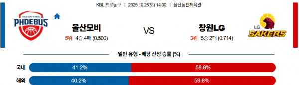 울산 현대모비스는 최근 서울삼성전 승리로 분위기를 바꿨지만 홈에서는 1승2패로 다소 부진하고 상대전 6연패를 당하고 있는 가운데 후반 집중력 저하가 아쉽다. 반면, 창원 LG는 2연승으로 상승세를 타고 있으며 아셈 마레이(FW)가 골밑에서 압도적인 존재감을 보여주고 있다. 칼 타마요(FW)의 돌파와 중거리슛이 팀 공격의 핵심이고, 리바운드 우위와 수비 조직력도 안정적이다.
