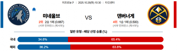 덴버는 요키치가 시즌 초반부터 트리플더블을 기록하며 경기 조율을 완벽하게 해내고 있고 고든과 머레이의 득점도 안정적이다, 반면, 미네소타는 에드워즈 부상 변수로 공격 전개가 단조로워질 가능성이 크고 백투백 일정으로 체력 부담도 있다.