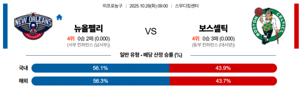 뉴올리언스와 보스턴 모두 최근 경기에서 리바운드 열세와 수비 전환 약점을 드러내며 실점 억제에 어려움을 겪고 있다, 또한, 보스턴은 세컨드 찬스 실점이 많아 경기 흐름을 통제하지 못하는 모습이 반복된다. 하지만, 이번 경기에서는 두 팀 모두 연패 탈출을 위해서 수비 집중력을 끌어올릴 것으로 예상되며 233.5점 기준이 된다면 언더 경기다.