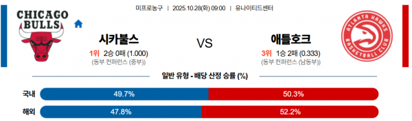 시카고는 최근 2연승을 달리며 속공과 리바운드에서 우위를 점하고 있고 코비 화이트 결장에도 조시 기디 등 다수 선수의 고른 활약이 돋보인다. 반면, 애틀랜타는 핵심 자카리 리사셔, 제일런 존슨, 포르징기스 등 발목 부상자 다수가 있고 트레이 영 의존도가 커 수비 밸런스가 흔들릴 우려가 있다.