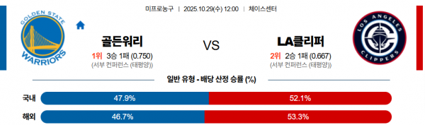 골든스테이트는 연속경기 일정에 따른 체력 부담과 턴오버 리스크가 남아 있으며 스테픈 커리의 최근 득점 기복도 변수다, 반면, 클리퍼스는 하든의 게임 메이킹과 카와이 레너드의 클러치 생산성이 안정적이고 최근 경기력 반등세 뚜렷하다, 인사이드에서도 주바츠가 그린과 로페즈를 상대로 우위를 점할 가능성이 높아 경기 주도권을 가져올 전망이다.