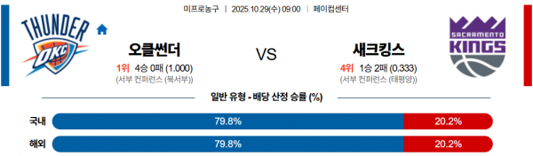 오클라호마SMS 샤이 길저스 알렉산더 중심의 트랜지션 우위와 홈그런의 림 보호가 강점이며 4연승 기세가 이어지고 있다, 반면, 다음날 원정에서 시카고를 만나는 일정을 위해서 힘을 분산해야 하는 새크라멘토는 수비 조직 불안과 후반 집중력 저하가 반복되고 있어 상위권 팀 상대로는 대응력이 떨어진다,