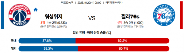 워싱턴은 홈 개막전에서 전반 리드를 잡고도 후반 수비 붕괴로 대패했고 3경기 평균 128.7실점으로 수비 조직력이 흔들리고 있다, 반면 필라델피아는 엠비드 결장 속에서도 맥시와 우브레 주니어가 중심을 잡으며 3연승을 기록 중이며 벤치 득점과 외곽 효율까지 안정적이다. 또한, 조엘 엠비드가 복귀 예정이며 폴 조지가 돌아온다. 수비 약점을 노리는 전개로 필라델피아가 흐름을 이어갈 가능성이 높다
