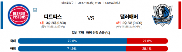 CDMX아레나(멕시코) 중립구장에서 펼쳐지는 경기다.디트로이트는 최근 4경기 3승1패로 상승세를 타고 있으며 커닝햄과 듀런의 조합이 완전히 살아났다. 특히 인사이드 장악력과 에너지 레벨에서 상대를 압도하고 있으며 외곽 효율도 안정적이다. 반면 댈러스는 어빙과 데이비스의 이탈로 전력 공백이 크고, 젊은 자원 중심의 로테이션이 중립 경기장에서 경험 부족을 드러낼 가능성이 높다