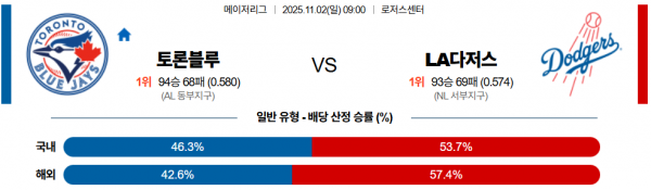 한국과 일본은 5차전으로 끝났지만 메이저리그는 결국 끝까지 가고 말았다. 양 팀 모두 동원할수 있는건 모두 동원할 태세. 양 팀의 타격을 고려한다면 이번 경기는 접전 그 자체. 하지만 선발에서 확실하게 토론토가 밀리기도 하고 이러한 짜내기 야구는 로버츠 감독의 전문분야다. 접전에 강한 LA 다저스가 월드시리즈 우승을 차지할 것이다.