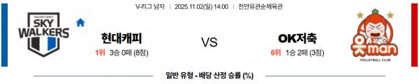 ⚠️ 전술 완성도와 리시브 라인의 안정감을 감안하면, 현대캐피탈이 흐름을 완벽히 주도할 경기다!