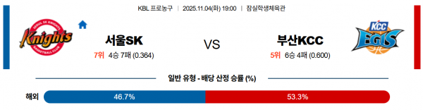 후반 페이스 관리와 트랜지션 리듬 유지 능력까지 고려하면 부산KCC가 승리 흐름을 쥘 확률이 높다.