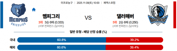 멤피스는 최근 홈 2연패에도 불구하고 자 모란트가 컨디션을 끌어올리고 있다. 캠 스펜서의 외곽 감각도 좋아 공격 밸런스가 서서히 회복되고 있으며, 잭 이디가 복귀하면 골밑 안정감이 커질 전망이다. 반면, 댈러스는 주축 빅맨 앤서니 데이비스와 카이리 어빙의 결장 여파로 페인트존 수비가 붕괴되어 3연패 중이다. 세트 오펜스 완성도가 낮고 리바운드 열세도 심각하다. 또한, 다음날 원정에서 워싱턴을 만나는 일정을 위해서 힘을 분산해야 하는 댈러스가 된다.