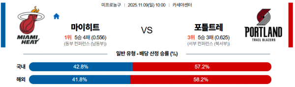 마이애미는 연속경기 일정이다. 마이애미 히트는 직전경기(11/8) 홈에서 샬럿 상대로 126-108 승리를 기록했으며 이전경기(11/6) 원정에서 덴버 상대로 112-122 패배를 기록했다. 최근 3경기 2승1패 흐름 속에 리바운드 37-57, 3점슛 12-10, 턴오버 8-18의 결과. 노먼 파웰이 25득점, 앤드유 위긴스가 22득점, 펠레 라르손이 19득점을 기록하며 팀을 승리로 이끌었던 경기. 1쿼터에서 53점을 폭발시키며 구단 역대 한 쿼터 최다 득점이자 NBA 역사상 두 번째로 높은 기록을 세웠던 상황. 가비지 타임에 추격을 허용했지만 안정적으로 승리를 지켜냈다. 정규시즌 홈경기에서는 3연승 성적.