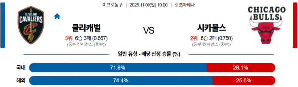 클리블랜드는 최근 3연승으로 상승세를 이어가며 팀 밸런스가 안정된 모습이다. 도노반 미첼이 꾸준히 득점을 책임지고 있고, 다리우스 갈랜드의 복귀로 볼 배급과 외곽 공격이 살아났다. 에반 모블리와 재럿 앨런이 골밑을 장악하며 수비에서도 견고함을 보여주고 있다. 반면, 시카고는 밀워키전 패배 후 원정 2연패에 빠졌고, 후반 수비 집중력 저하가 반복되고 있다. 조쉬 기디의 활약이 돋보이지만 팀 전반의 에너지 유지에 한계가 있다. 홈에서 강한 클리블랜드가 수비 집중력을 앞세워 경기 흐름을 주도할 전망이다