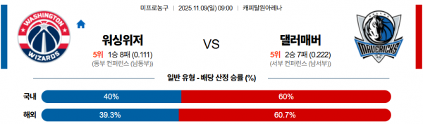 11월 9일 NBA 워싱위저 vs 댈러매버