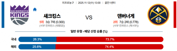 다음날 홈에서 애틀란타를 만나는 새크라멘토와 다음날 원정에서 LA클리퍼스를 만나는 일정을 위해서 힘을 분산해야 하는 덴버의 만남 이다. 덴버 너게츠는 니콜라 요키치가 최근 트리플더블급 활약을 펼치며 팀의 중심을 잡았고, 머레이와 고든이 빠져도 피켓과 왓슨이 득점을 보탠 점이 긍정적이다. 반면, 새크라멘토 킹스는 수비 전환이 느리고 3점슛 의존도가 높아 공격 효율이 떨어지는 문제가 반복되고 있다. 특히 최근 홈 두 경기에서 130점 이상을 내주며 수비 불안이 뚜렷하다.