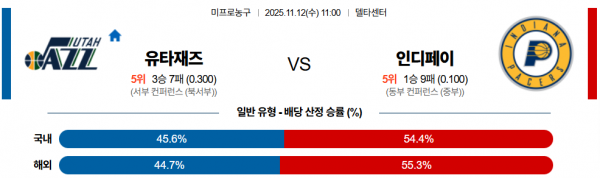 유타는 연속경기 일정이다. 유타는 케슬러의 이탈로 골밑 수비에 약점이 있지만, 홈에서는 리듬 있는 패스 플레이와 빠른 전환 공격으로 이를 보완하고 있다. 반면, 인디애나는 주전 4명이 부상으로 이탈하며 전력 손실이 심각하다. 할리버튼과 토핀의 부재로 공격 전개가 단조롭고, 수비 로테이션이 흔들리고 있다. 원정 5연패 흐름 속에서 에너지 레벨도 떨어져 있다.
