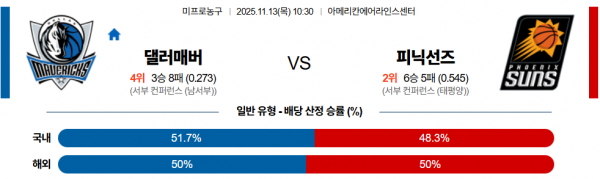 11월 13일 NBA 댈러매버 vs 피닉선즈