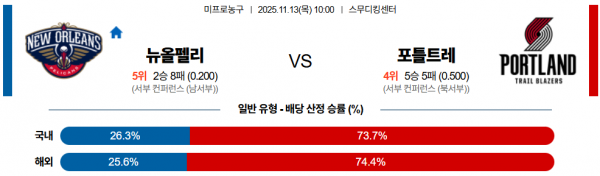 포틀랜드는 셰이든 샤프와 데니 아브디야를 중심으로 한 외곽 득점력이 안정적으로 유지되고 있으며, 최근 경기에서도 후반 집중력과 공격 전개 속도에서 긍정적인 흐름을 보이고 있다. 반면, 뉴올리언스는 자이언 윌리엄슨과 조던 풀 등 주전 다수가 빠지며 전력 누수가 심각하고, 수비 조직이 완전히 흔들려 연속 실점이 잦다.