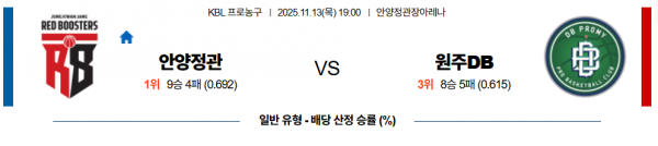 정관장은 직전 경기에서 완승을 거두며 분위기를 반전시켰고, 변준형과 아반도가 안정적으로 공격을 이끌고 있다. 오브라이언트가 골밑에서 존재감을 보였고, 전성현이 부상 복귀로 득점 자원을 보강해 전력의 균형이 잡혔다. 또한 홈에서 6승2패로 강세를 보이며 수비 집중력이 향상된 모습이다. 반면, 원주DB는 국내 선수들의 득점 부진이 이어지고 있고 외곽 수비도 불안하다.