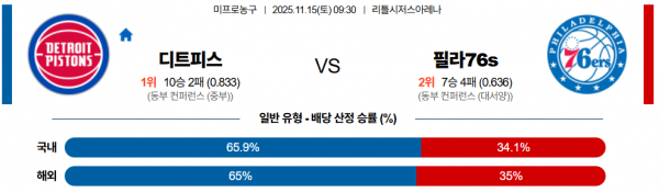 핵심 5인방 결장이 결장한 시카고와 경기에서 승리를 기록하면서 상승세를 이어간 효과가 기대 되는 디트로이트는 팀 전체 에너지와 밸런스가 살아났다. 핵심 자원의 부재 속에서도 폴 리드가 골밑을 장악하고 던컨 로빈슨의 외곽 지원이 더해지며 득점 루트가 다양해졌고, 루키 다니스 젠킨스가 안정적인 경기 조율로 백코트를 지휘했다. 반면, 필라델피아는 조엘 엠비드의 부상 공백이 이어지고 원정 2연패에 빠지며 완전한 전력이 아니다. 타이리스 맥시가 분전하고 있지만 골밑 수비와 리바운드에서 불안이 여전하다. 디트로이트의 승리가 예상된다.