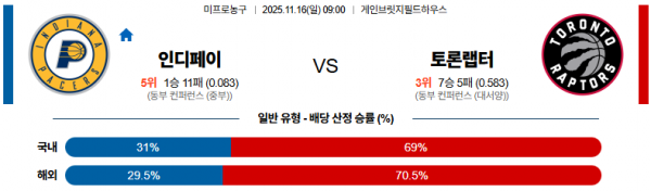 토론토는 스코티 반즈가 맹활약하며 팀의 중심을 잡고 있고, 임마누엘 퀴클리와 야콥 퍼틀이 안정적인 득점 지원을 이어가고 있다. 최근 원정 2연승으로 흐름이 좋고, 야투 성공률과 리바운드에서 모두 상대를 압도하는 효율적인 농구를 펼치고 있다. 반면, 인디애나는 주축 선수들의 연쇄 부상으로 전력이 크게 약화되며 6연패 늪에 빠져 있다. 할리버튼과 토핀의 이탈로 경기 운영과 골밑 수비 모두 불안정하고, 매서린과 네스미스의 부상까지 겹쳐 팀 조직력이 무너졌다.